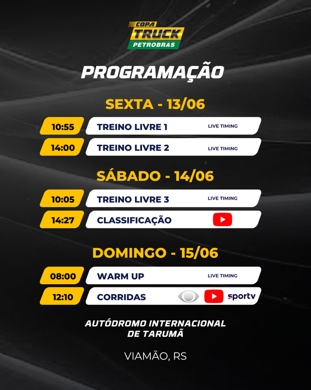 No caso dos brutos, a largada para as duas corridas da etapa de Tarumã está marcada para acontecer às 12h10, com transmissão ao vivo da Band, SporTV e diversos canais digitais (CATVE.com e Copa Truck, Esporte na Band, Portal Highspeed e Parc Fermé no YouTube). Confira abaixo a programação completa: